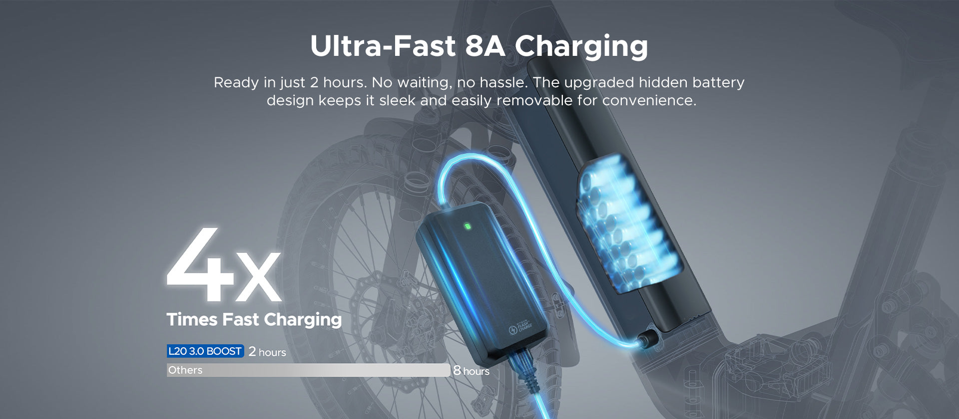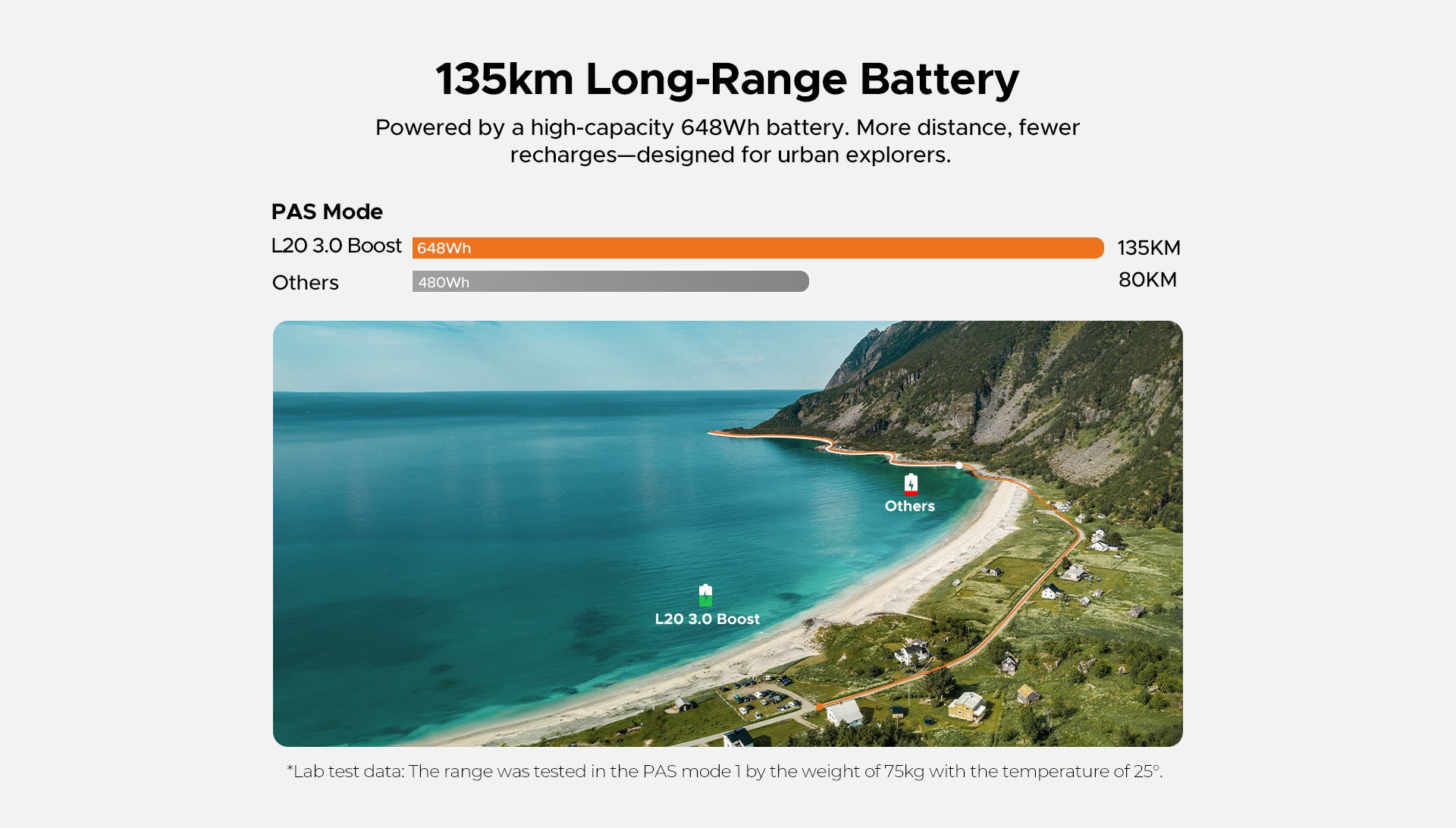 The L20 3.0 Boost offers a range of up to 120 km (75 miles) per charge in optimal riding conditions. Actual distance depends on rider weight, terrain, riding mode, and weather.